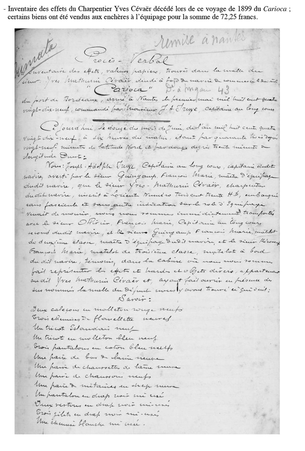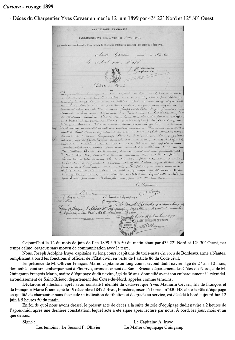Décédé le 12 juin 1899 en mer par 43° 22' Nord et 12°30' Ouest
