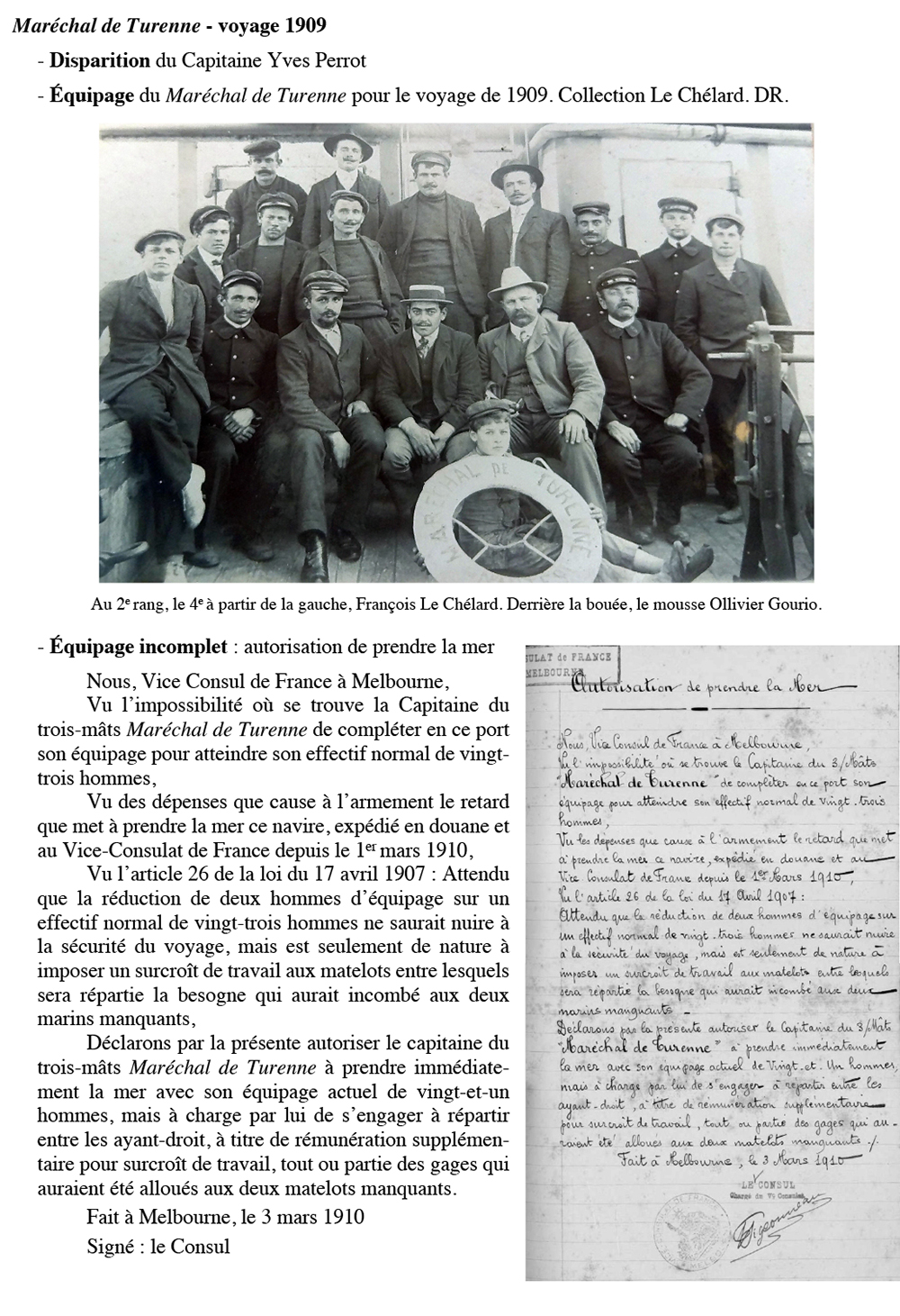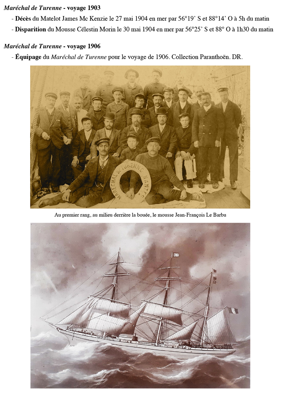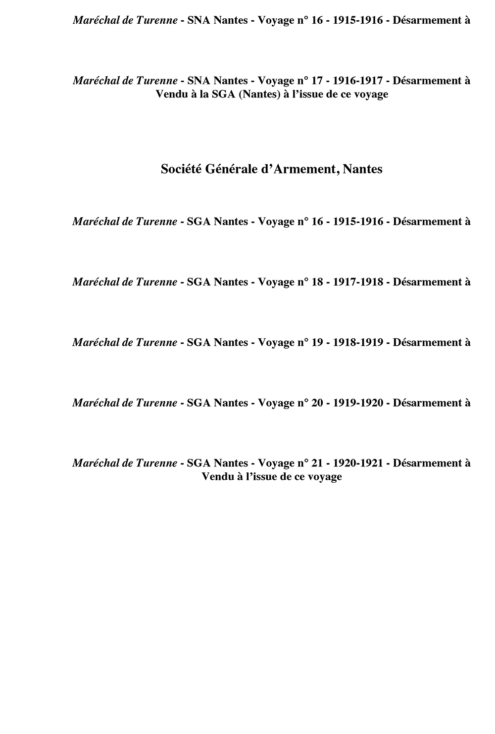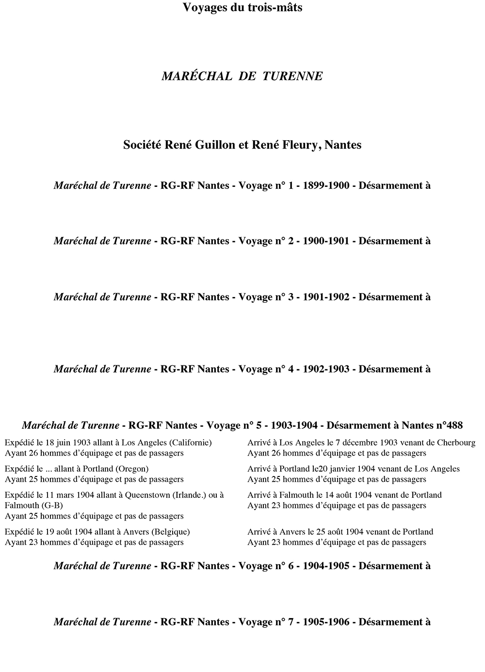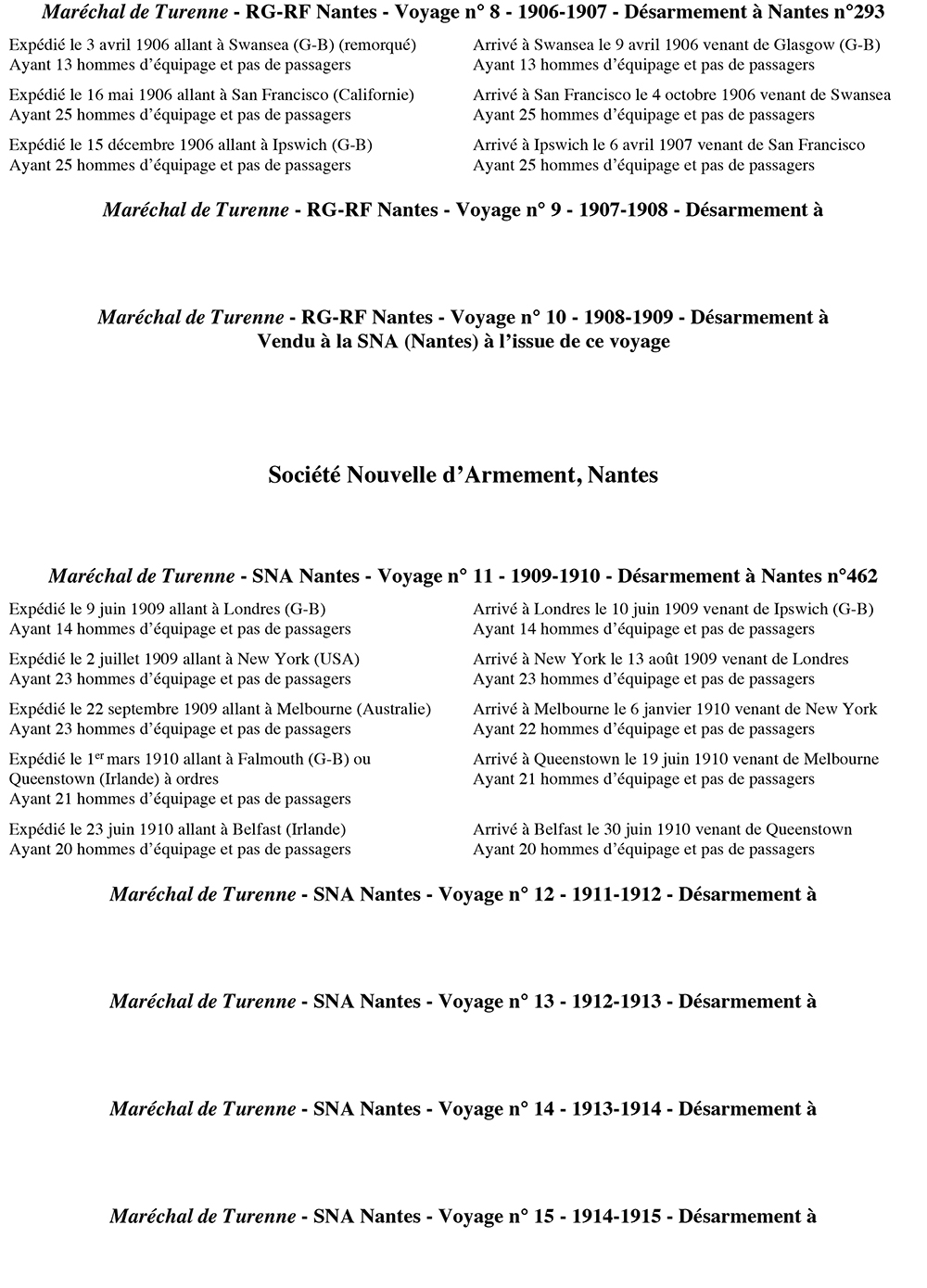 Maréchal de Turenne navigue pour la Sté Nouvelle d'Armement (Nantes) de 1908 à 1916 Construit en 1899 pour René Guillon et René Fleury (Nantes), Maréchal de Turenne est ensuite vendu à la Société Nouvelle d'Armement (Nantes), puis à la Société Générale d'Armement (Nantes). Désarmé au Canal de la Martinière en 1921. Démoli en 1927.