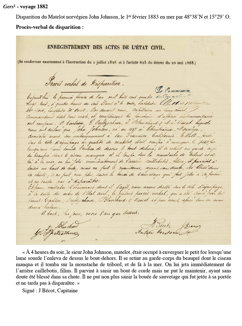 Étranger. Disparu en mer le 1er février 1883, par 44° Nord et 30° Ouest.
