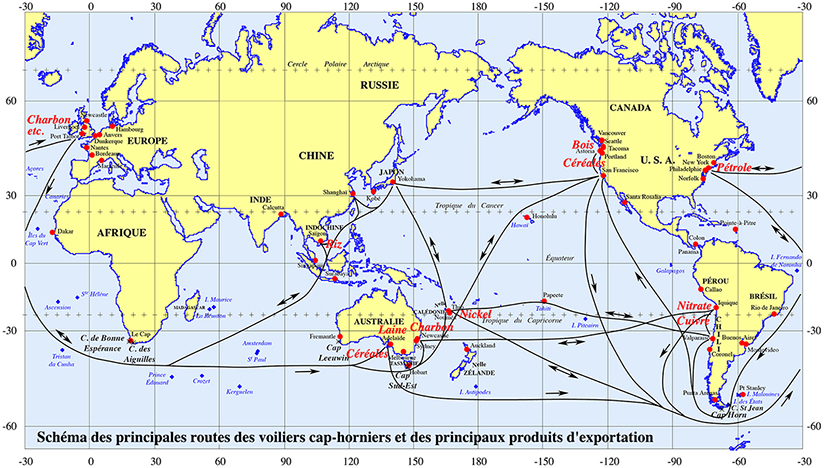 Dans les années 1880, l’économie des pays de la côte Ouest des Amériques est florissante. Ces pays ont besoin de tout pour développer leur industrie et leurs transports, de charbon en particulier, qui remplace le bois comme source d’énergie. Seule, d’abord, la Grande-Bretagne en produit industriellement, l’Australie le fera peu après. Le charbon et des produits industriels vont être la charge de navires allant d’Europe vers les Amériques, le retour étant assuré par des produits également pondéreux : nitrate, céréales, bois, métaux ou minerais, celui de nickel en particulier, produit en Nouvelle-Calédonie. La construction navale a fait de grand progrès, on sait maintenant faire des coques en acier, matériau moins fragile que le bois et mieux adapté pour le transport de pondéreux. La conjonction de ces facteurs fait que de nombreux armateurs acquièrent des flottes de voiliers de charge qui passeront pendant plus de 40 ans le cap Horn, passage obligé des navires puisque le canal de Panamá n’ouvrira qu’en 1914. Il n’y a pas encore d’alternative "vapeur" pour le transport de pondéreux sur de grandes distances.
