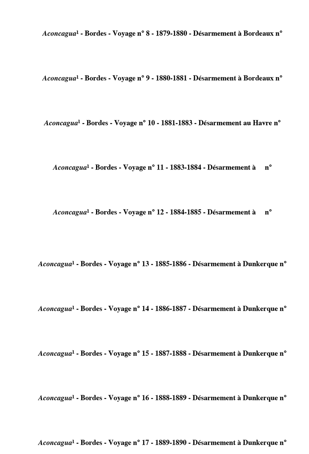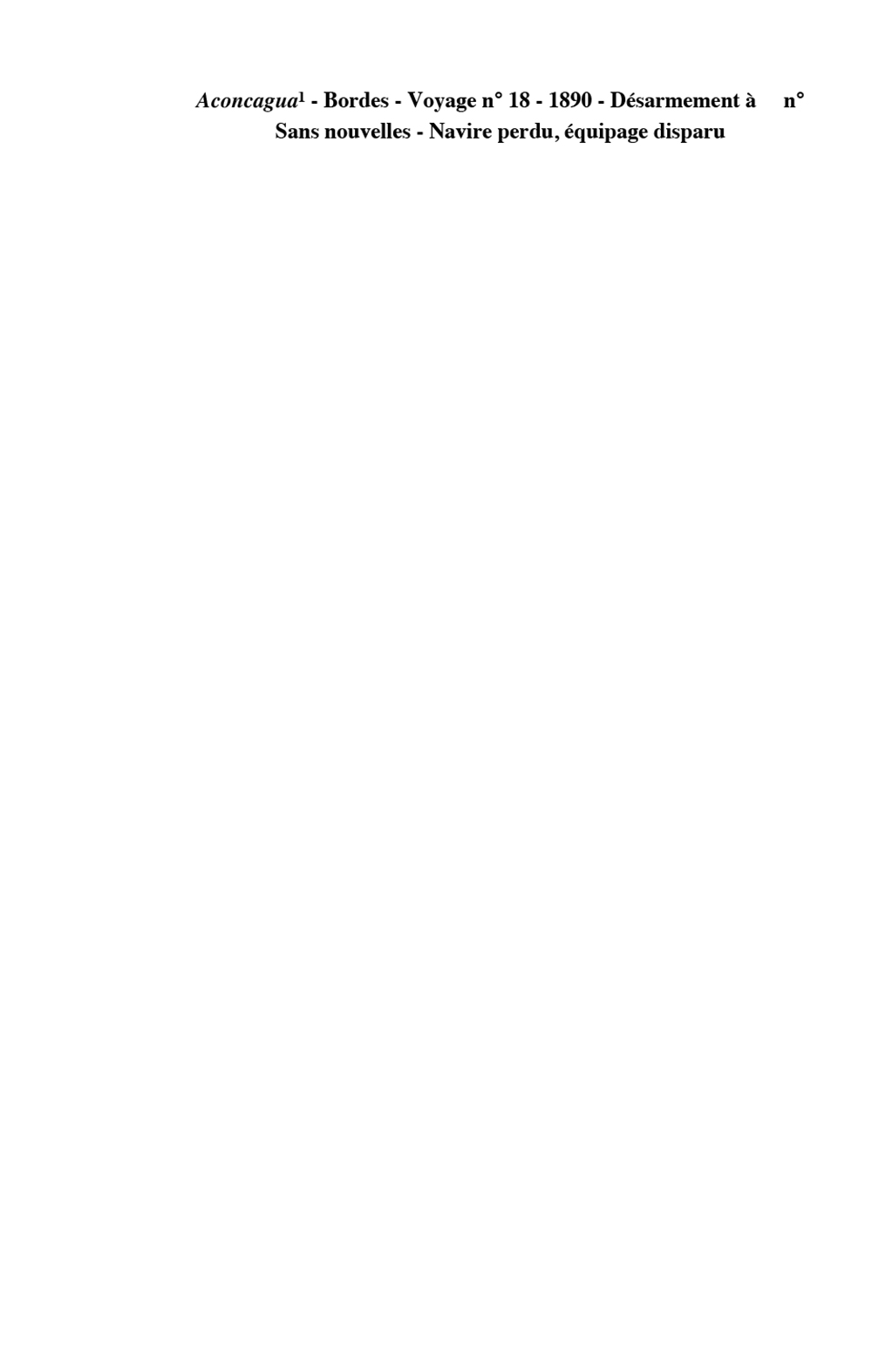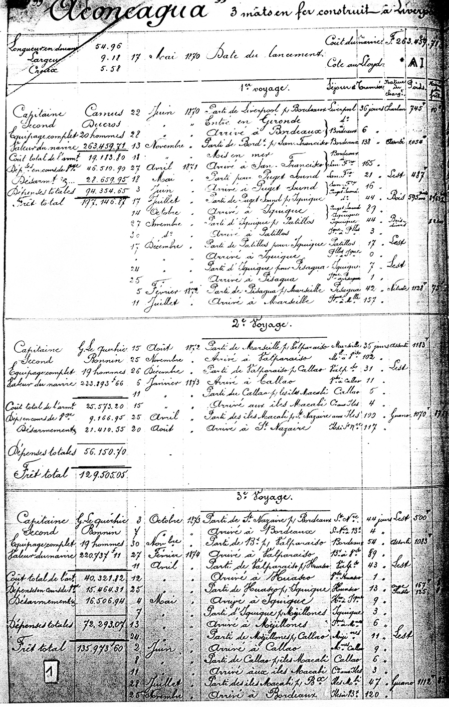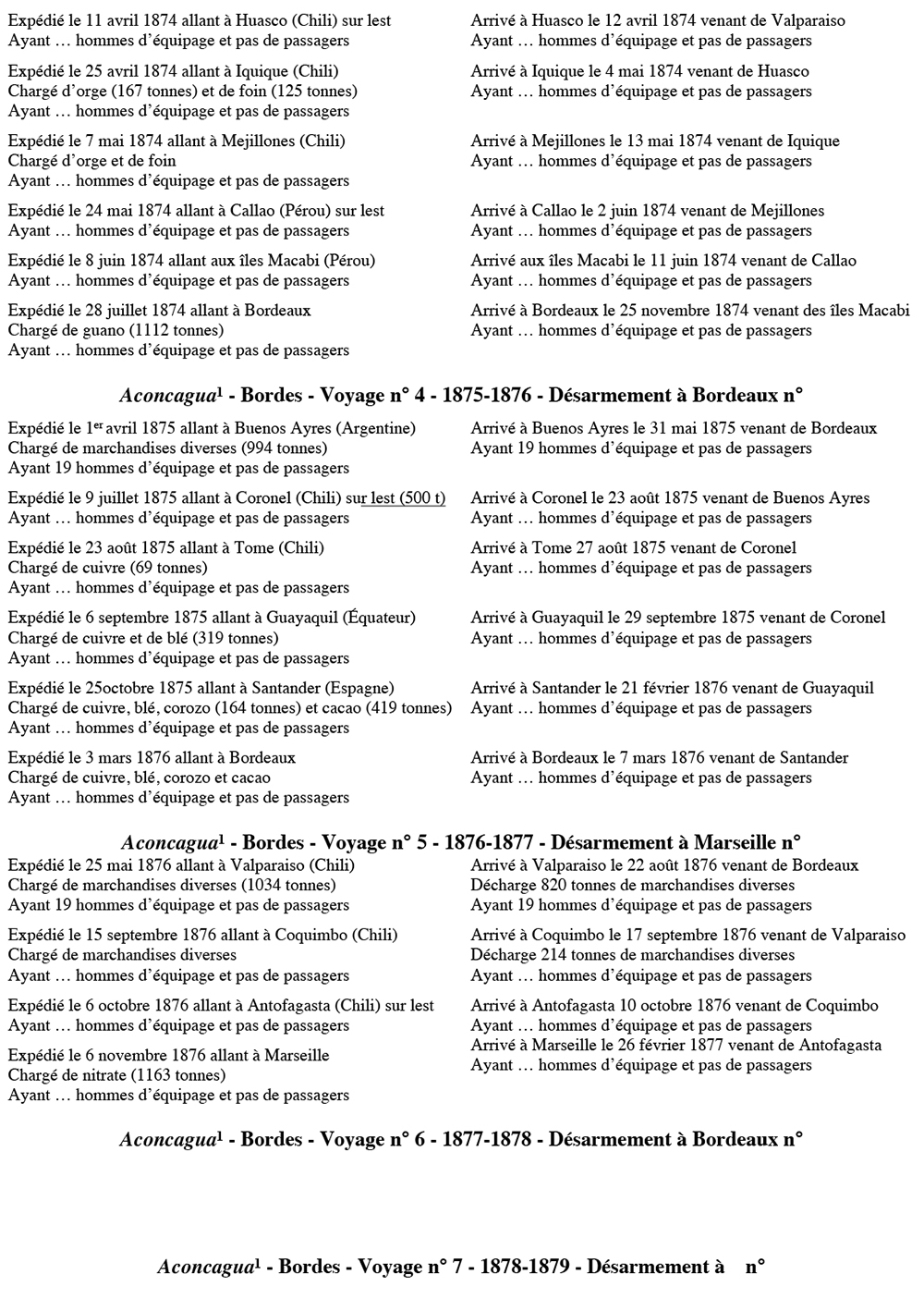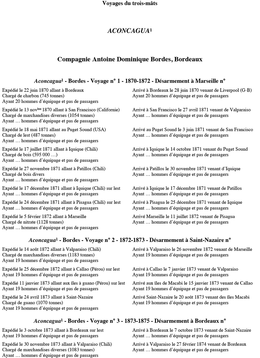 Construit en 1870 pour la Cie Bordes, Aconcagua-1 est perdu corps et biens en 1890 à son 18e voyage pour la Cie. Commandé par Joseph Ezan, il était parti de Newcastle (G-B) pour Valparaiso (Chili) le 19 mai 1890 avec un chargement de charbon et 17 hommes à bord.