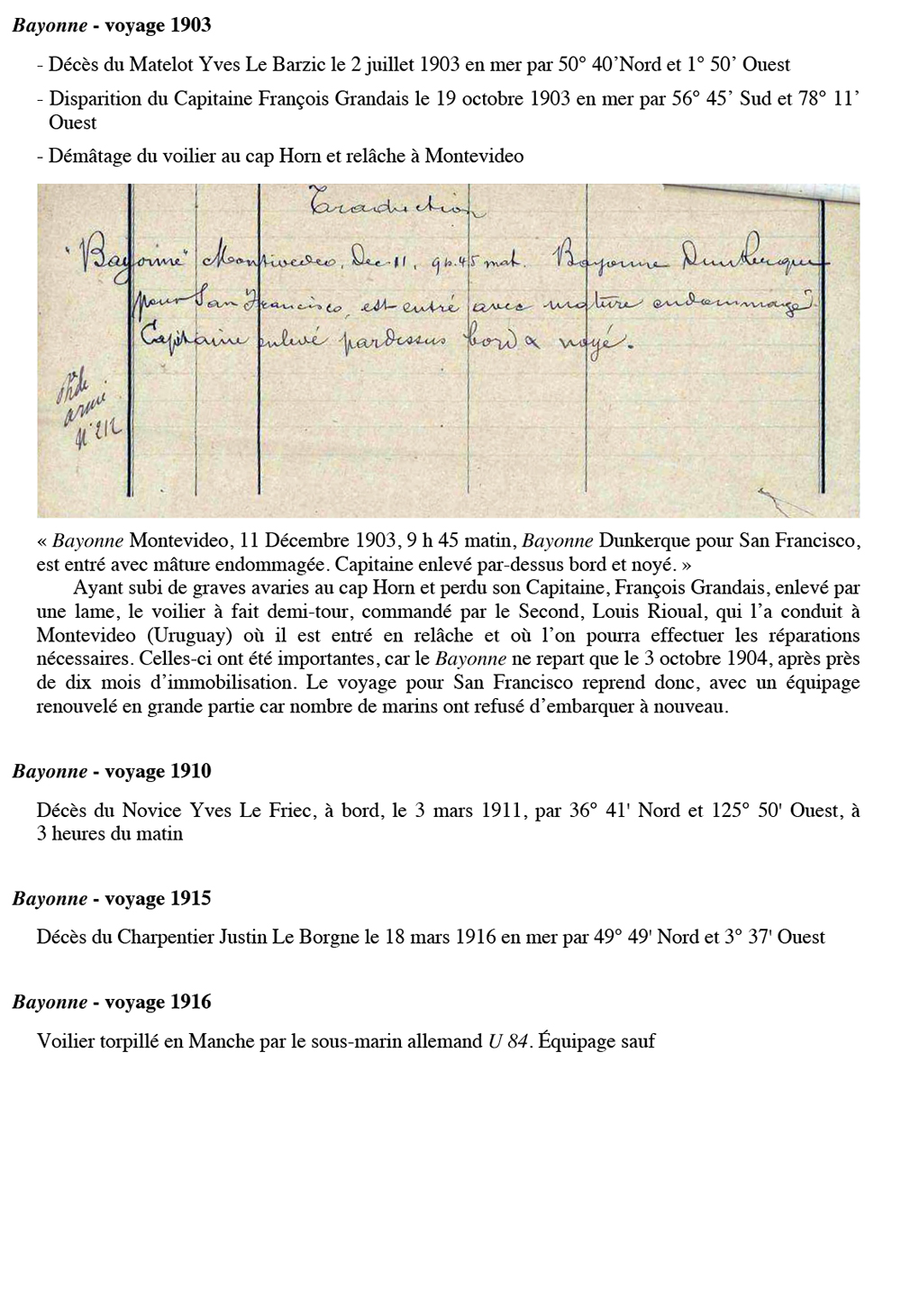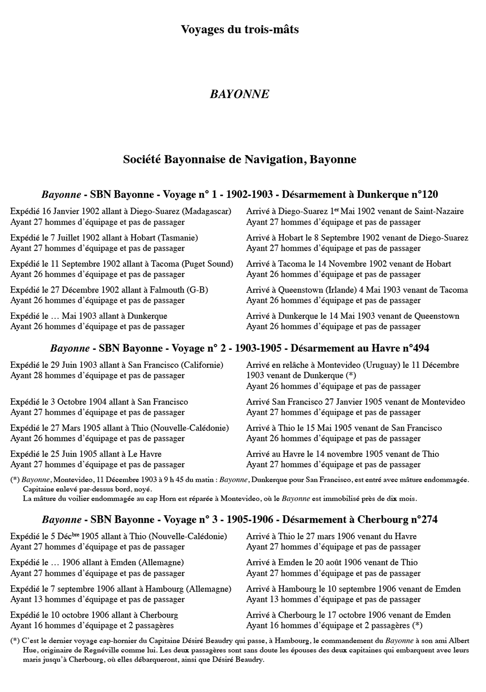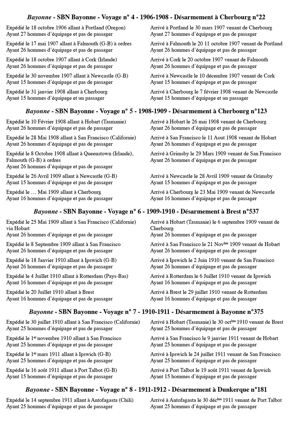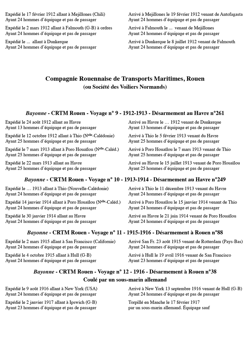 Bayonne navigue pour la Sté Rouennaise de Transports Maritimes de 1911 à 1917 Construit en 1901 pour la Sté Bayonnaise de Navigation, Bayonne est ensuite vendu à la Sté Rouennaise de Transports Maritimes. Le 17 février 1917, le voilier, non armé, est coulé à l'entrée de la Manche par le sous-marin allemand U 84. Équipage sauf.