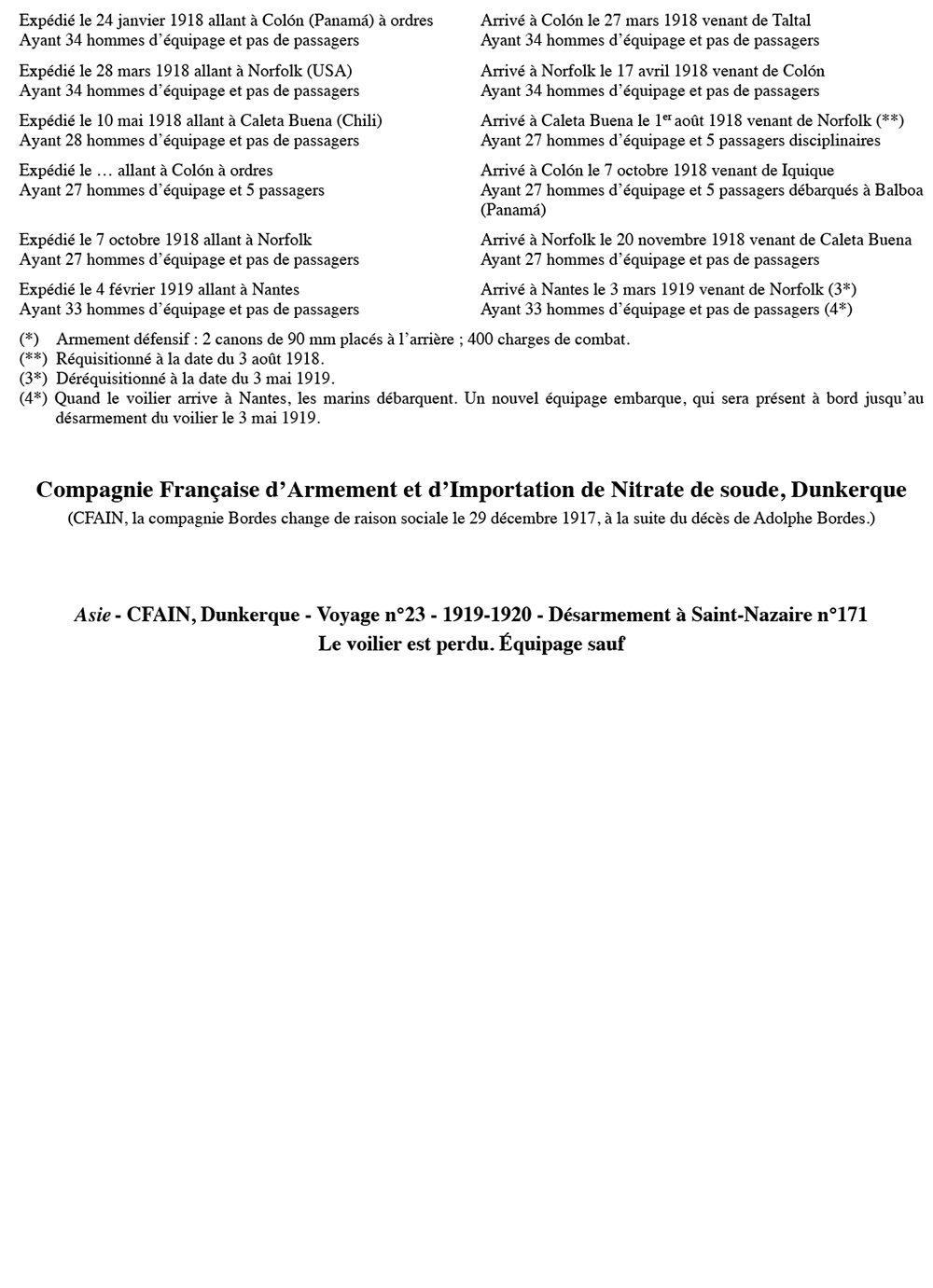 Asie navigue pour la Cie Bordes (Dunkerque) de 1908 à 1917 Construit en 1897 pour d'Orbigny et Faustin (La Rochelle), Asie est ensuite acheté par la Cie Bordes (Dunkerque) puis par la CFAIN (Dunkerque). Échoué le 28 décembre 1919 en Loire sur le récif des Jardinets. Équipage sauf.