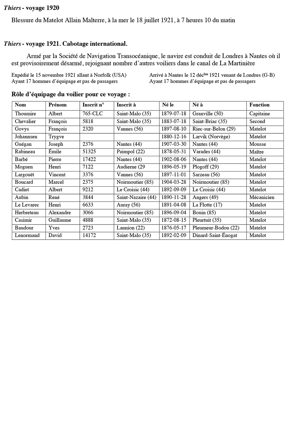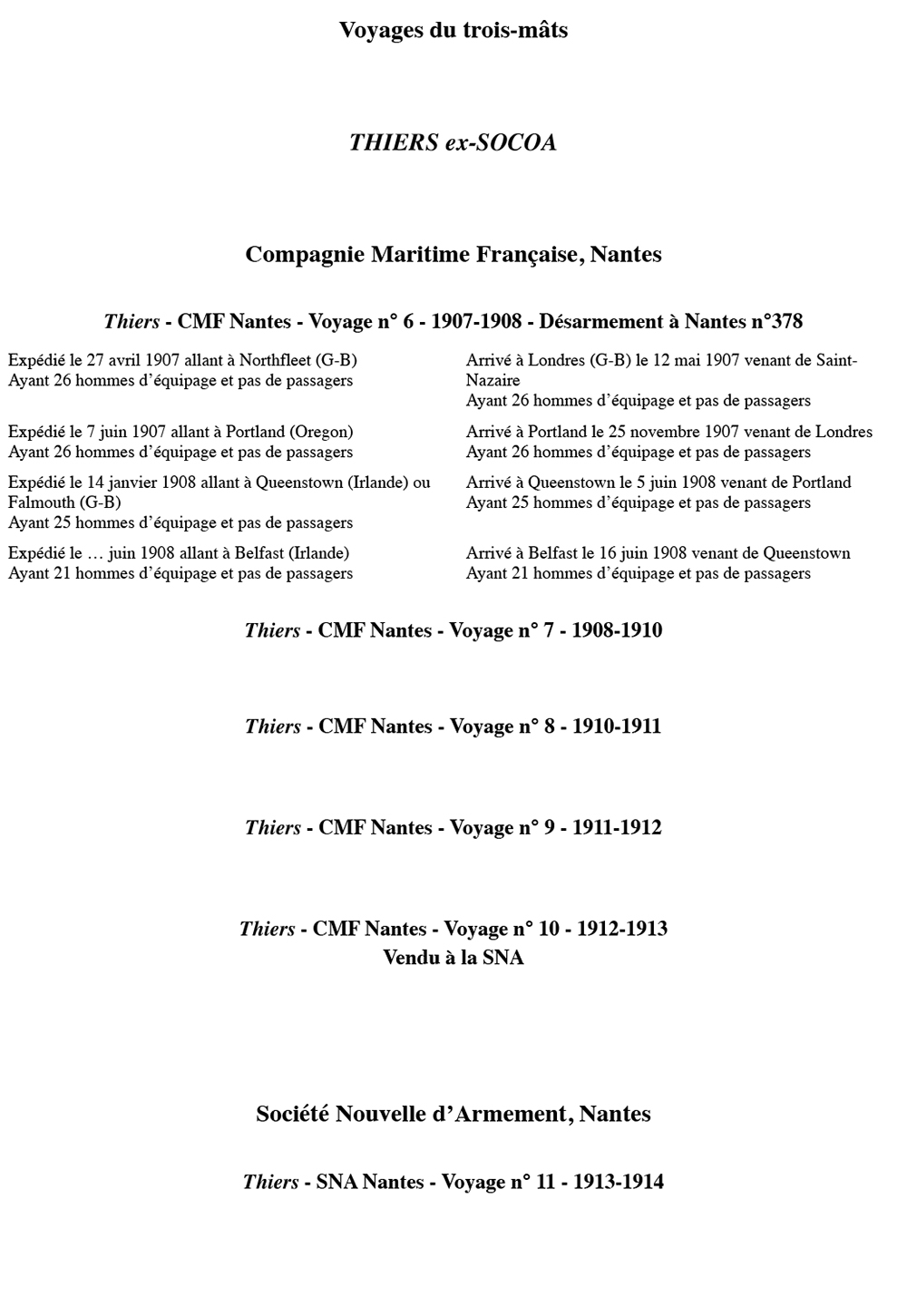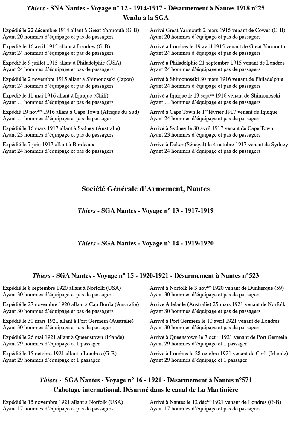 Thiers navigue pour la Sté Nouvelle d'Armement (Nantes) de 1913 à 1916