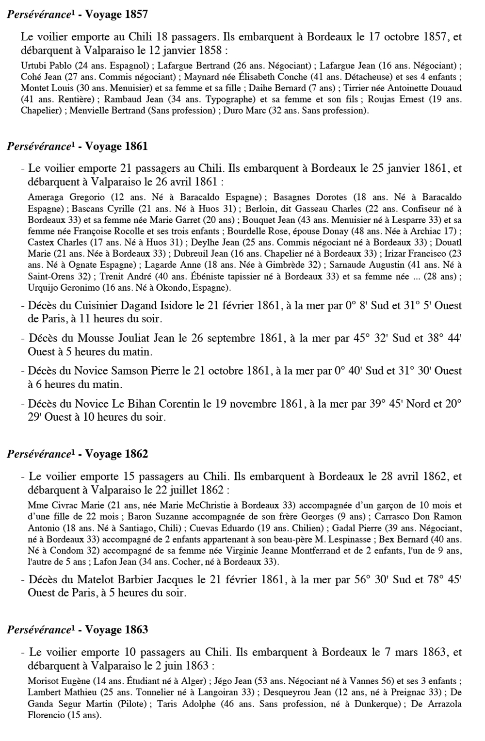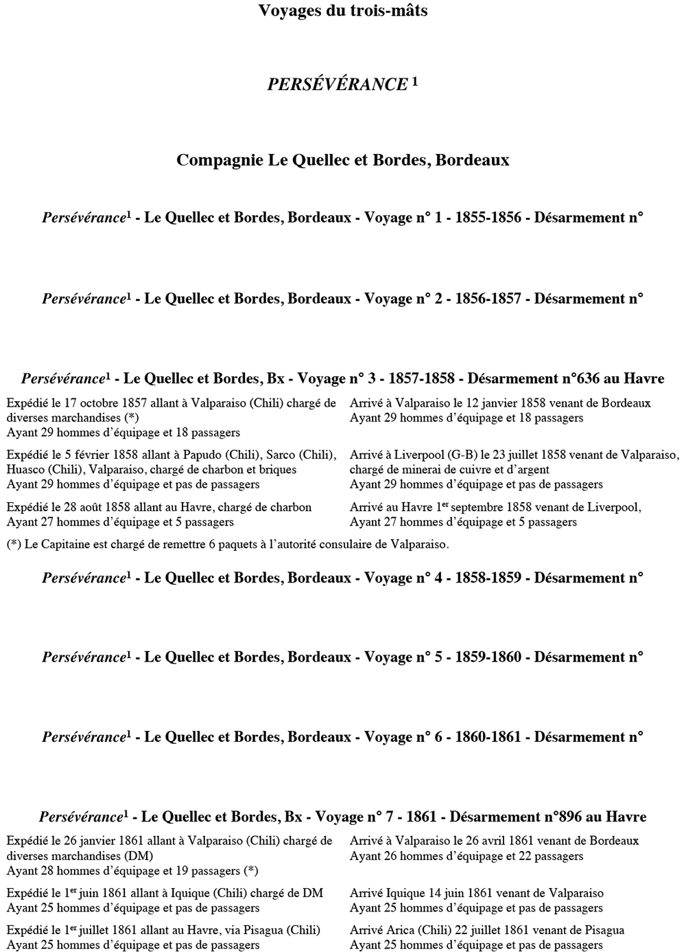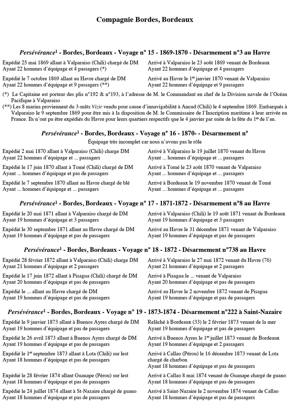 Construit en 1855 pour Le Quellec et Bordes (Bordeaux), Persévérance-1 est conservé par Bordes lors de la liquidation de la Cie Le Quellec et Bordes en 1869. Le 8 avril 1877, il s'échoue sur la pointe de Lizay (île de Ré). Le navire est perdu, l'équipage sauf.