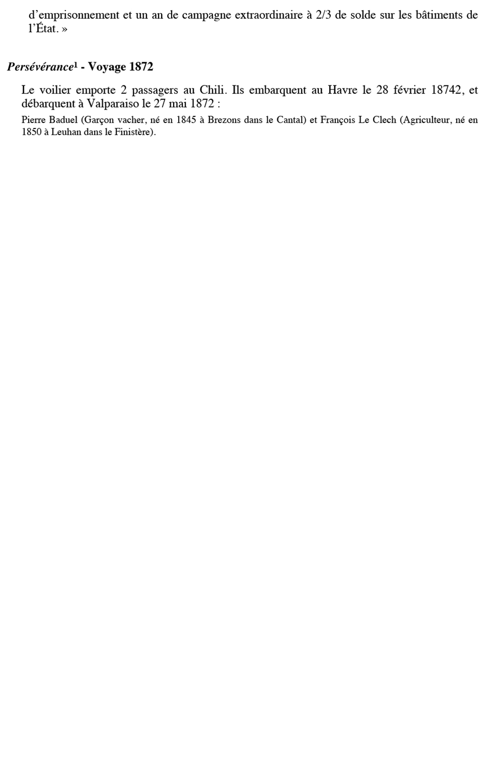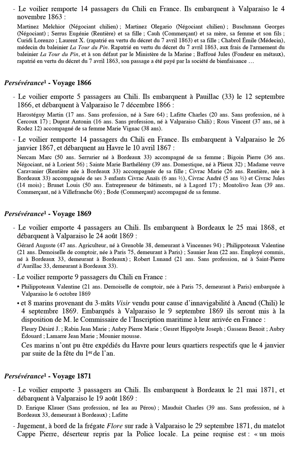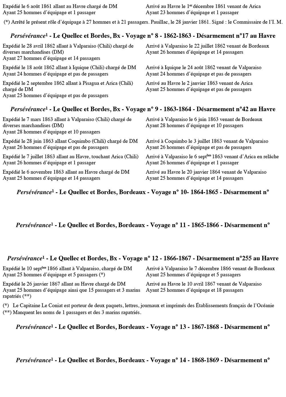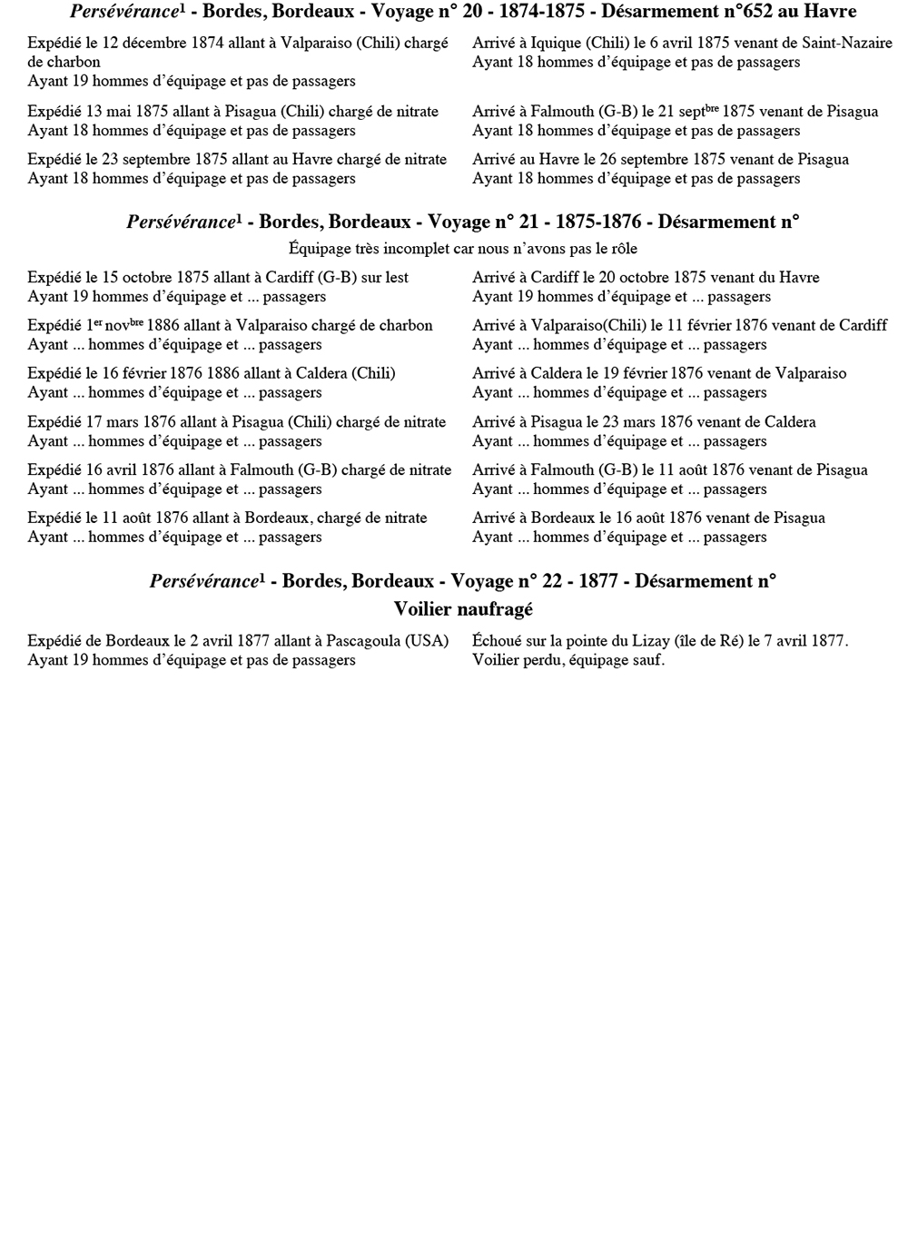 Construit en 1855 pour Le Quellec et Bordes (Bordeaux), Persévérance-1 est conservé par Bordes lors de la liquidation de la Cie Le Quellec et Bordes en 1869. Le 8 avril 1877, il s'échoue sur la pointe de Lizay (île de Ré). Le navire est perdu, l'équipage sauf.