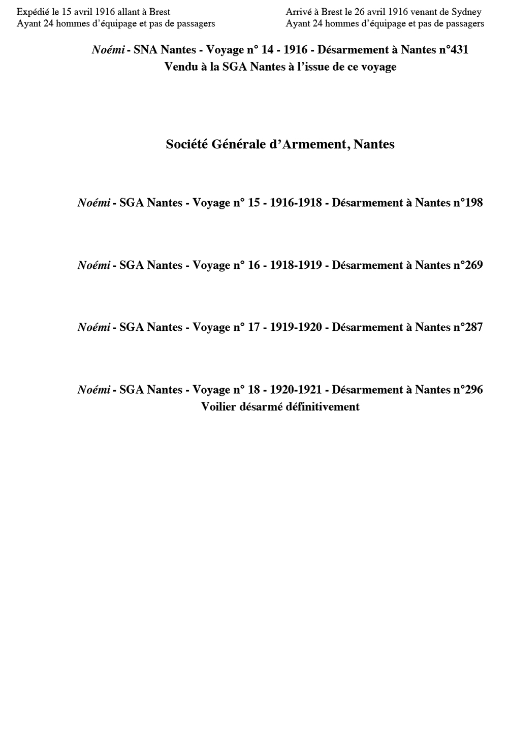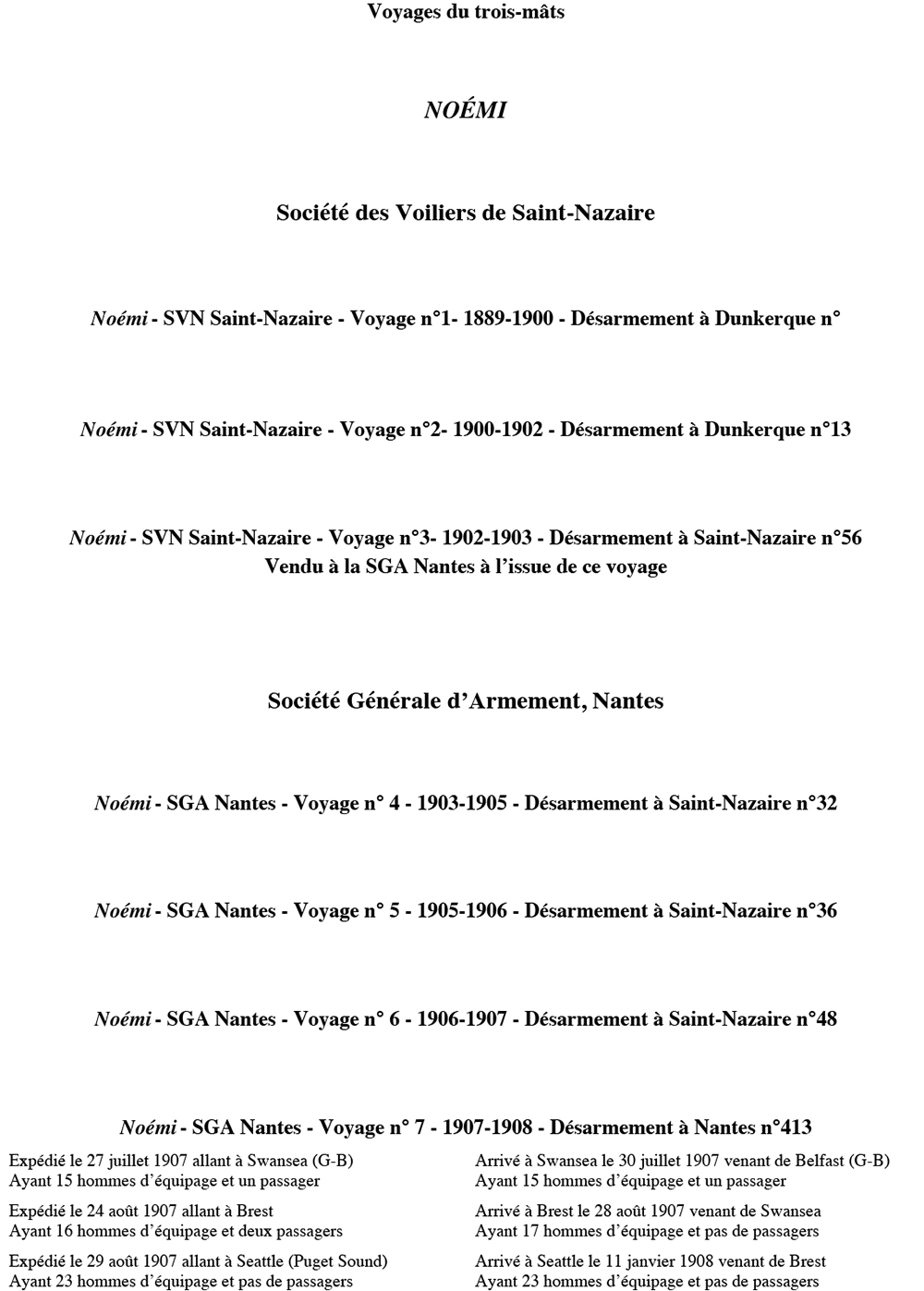 Construit en 1899 pour la Sté des Voiliers Nazairiens, Noémi est vendu à la Sté Générale d'Armement (Nantes) en 1903, puis à la Sté Nouvelle d'Armement (Nantes) en 1908, puis de nouveau à la Sté Générale d'Armement (Nantes) en 1916. Désarmé au Canal de la Martinière en juillet 1921. Démoli en 1927.