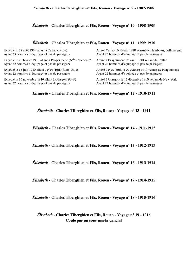 Élisabeth navigue pour Charles Thiberghien (Rouen) de 1899 à 1917 Construit en 1899 pour Charles Tiberghien (Rouen), Élisabeth, commandé par Joseph Prigent, est coulé à l'entrée de la Manche le 3 juin 1917 par le sous-marin allemand UC 79. Équipage sauf.